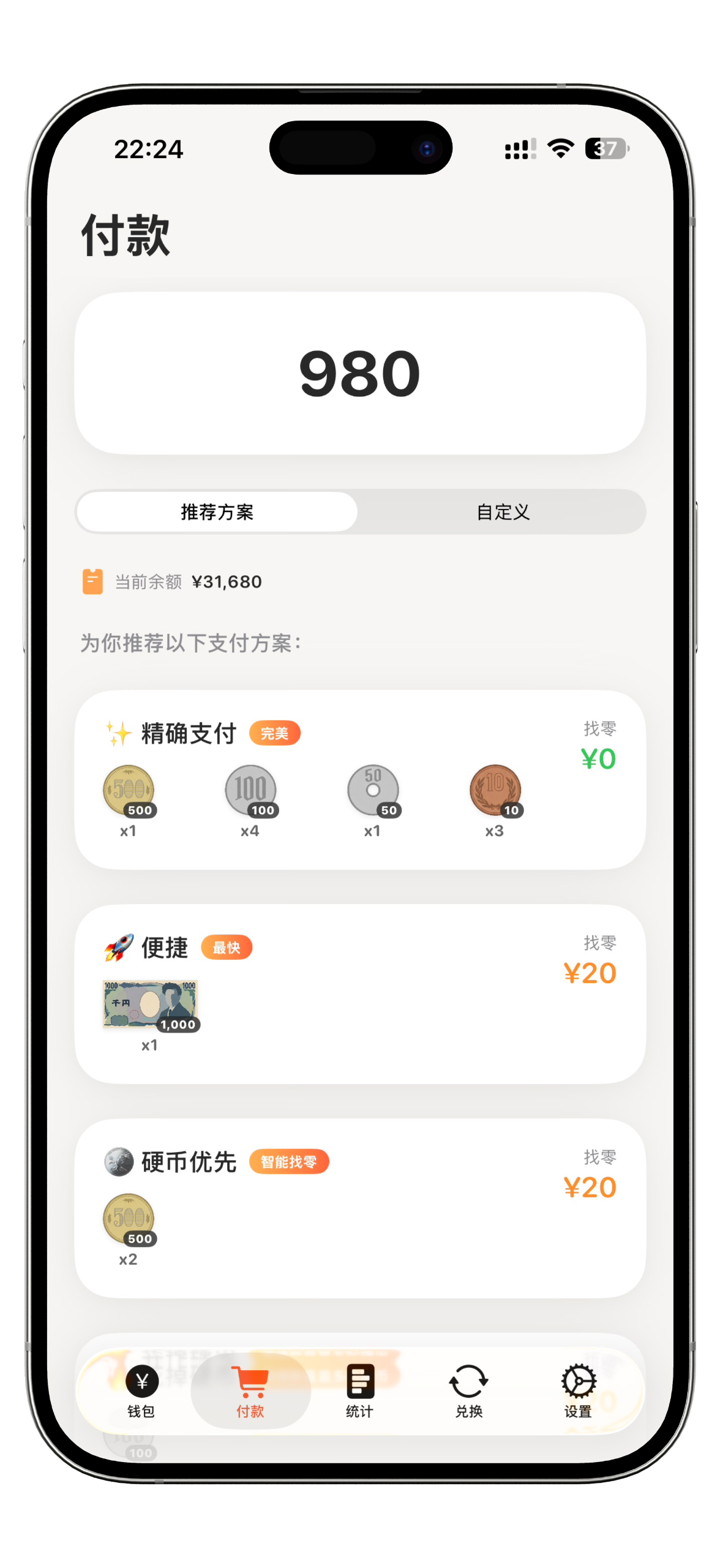 结账无需卡顿。 输入应付金额,智能算法立即生成多套支付方案。无论是清空零钱还是凑整找零,决策快人一步。另有自定义模式,付款自由灵活。²