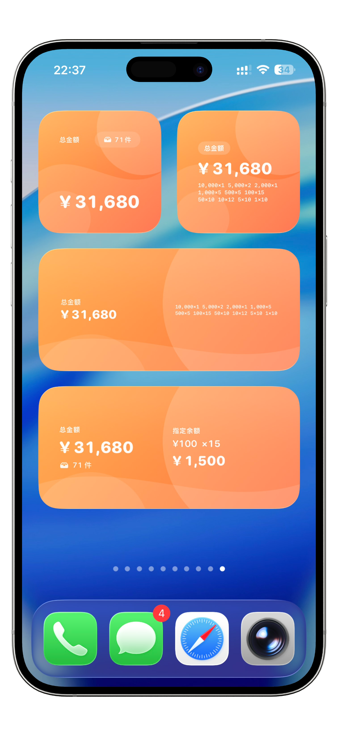 • 小组件 在桌面和锁屏添加小组件,无需打开 App 即可查看总金额或指定面额数量