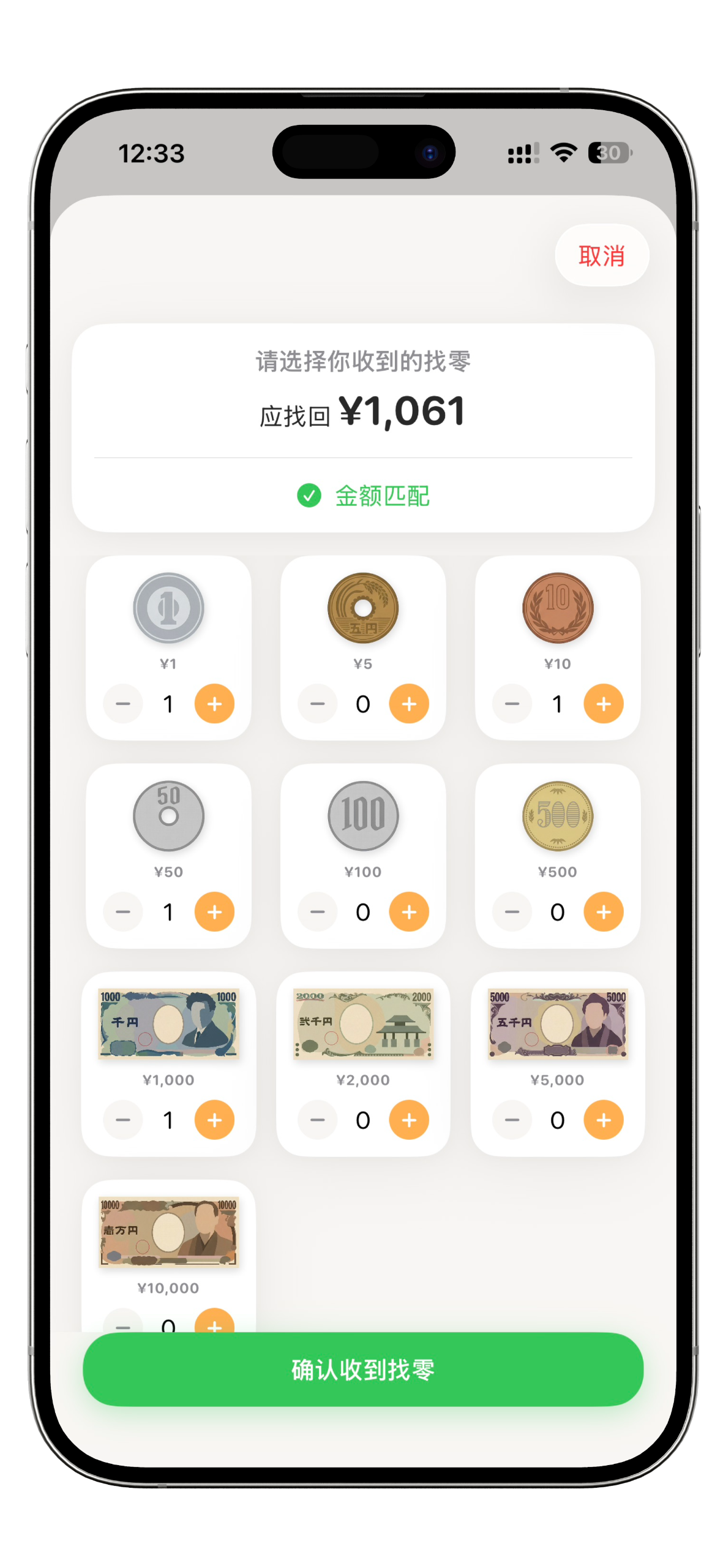 收银员找回满手硬币?告别手忙脚乱。只需输入付款金额,再简单点选硬币。一键“哗啦”,找零入袋。钱包余额瞬间同步。